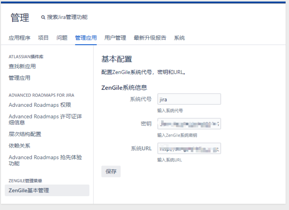 3. 在Jira中配置ZenGile的密钥等信息。