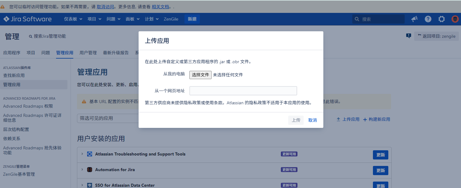 1. 首先在jira中安装ZenGile应用。需要使用jira的管理员账户进行登录安装。