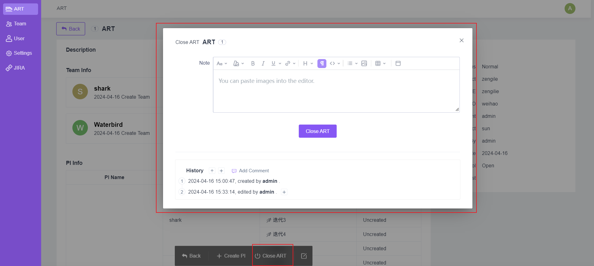 2. 在该页面下,可以关闭、编辑或删除现有的敏捷发布火车(ART)。也可以快速创建ART下的PI。