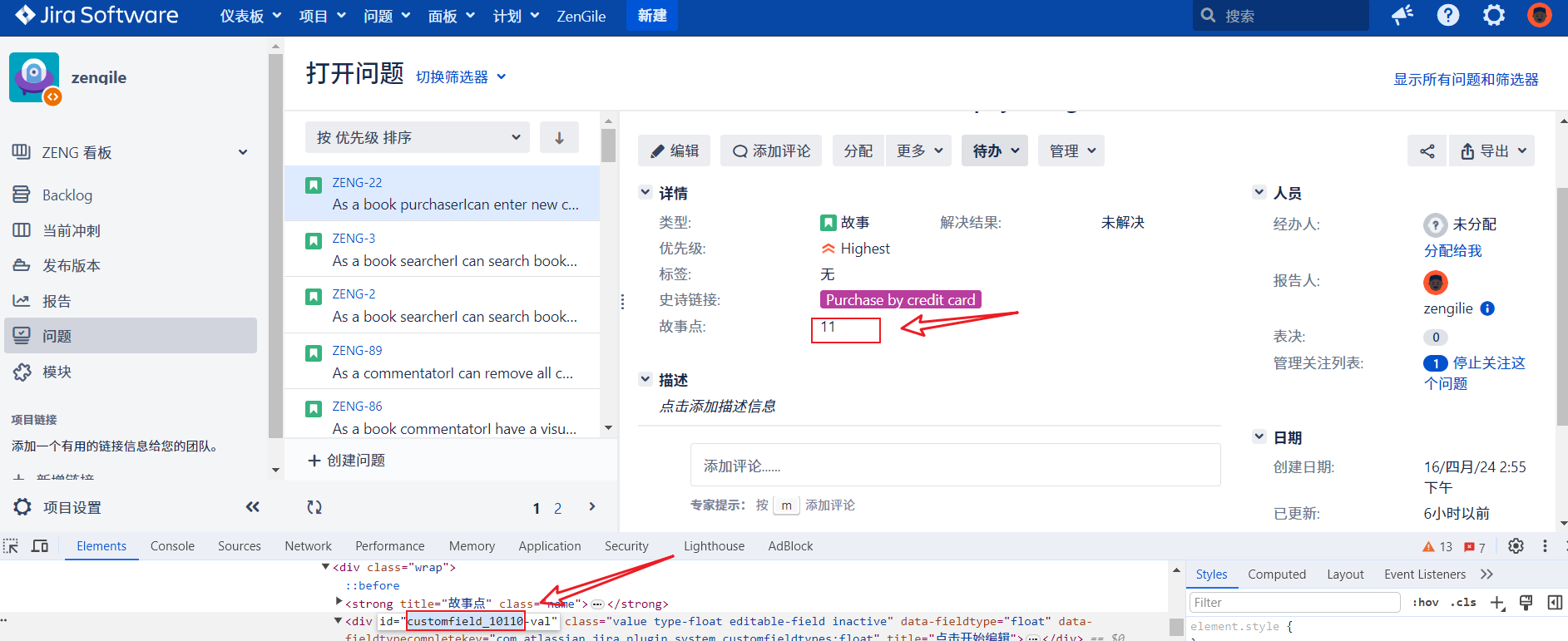 故事点字段需要使用开发者模式查看Jira中故事点的id,如下图: