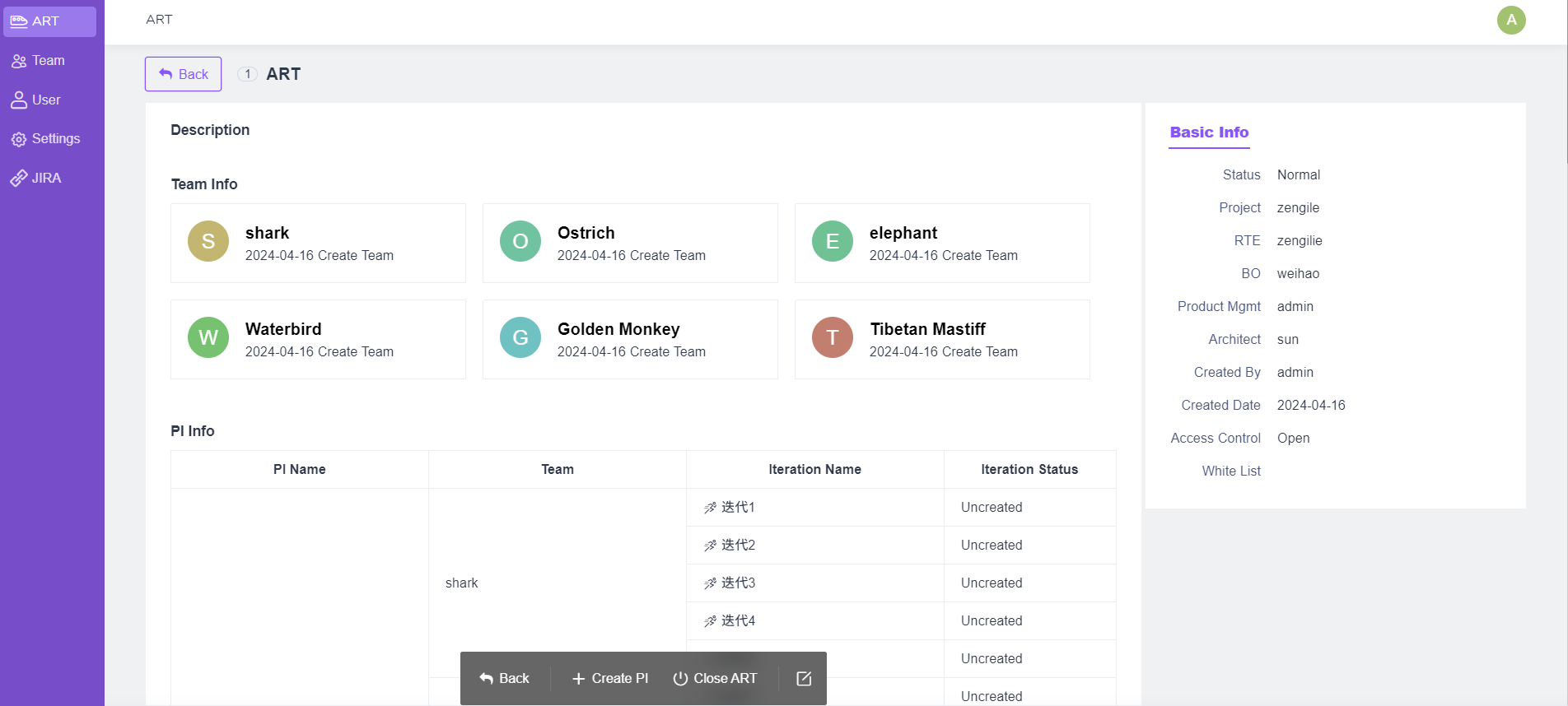 2. 在该页面下,可以关闭、编辑或删除现有的敏捷发布火车(ART)。也可以快速创建ART下的PI。